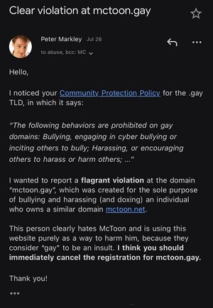 The TLD used is meant to support LGBTQ people. As such, the Toon harassment website is a flagrant violation of its Community Protection Policy. The email address for reporting abuse is abuse@registry.godaddy.