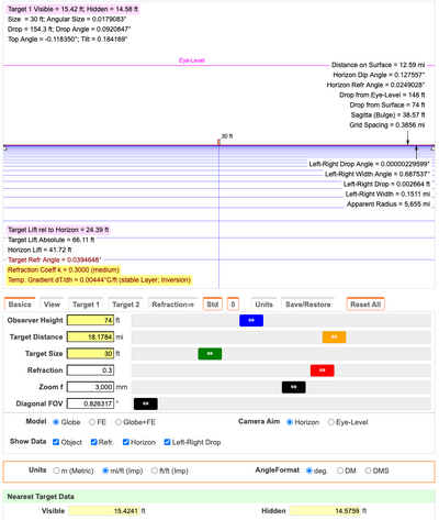 It's unclear how he computed this. But, you can compute this for yourself using Walter Bislin's Advanced Earth Curve Calculator. According to actual computation, and not even including the real-world effects of refraction there is a predicted blockage of ZERO FEET.