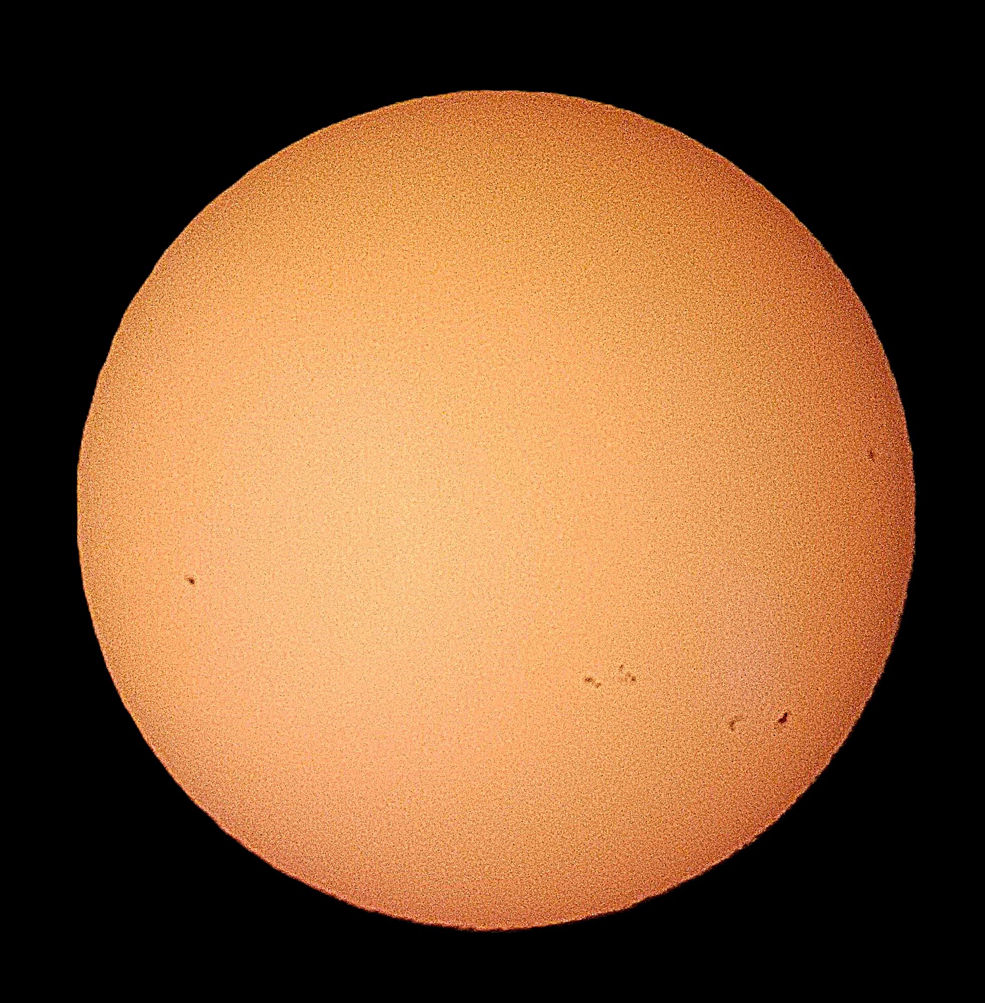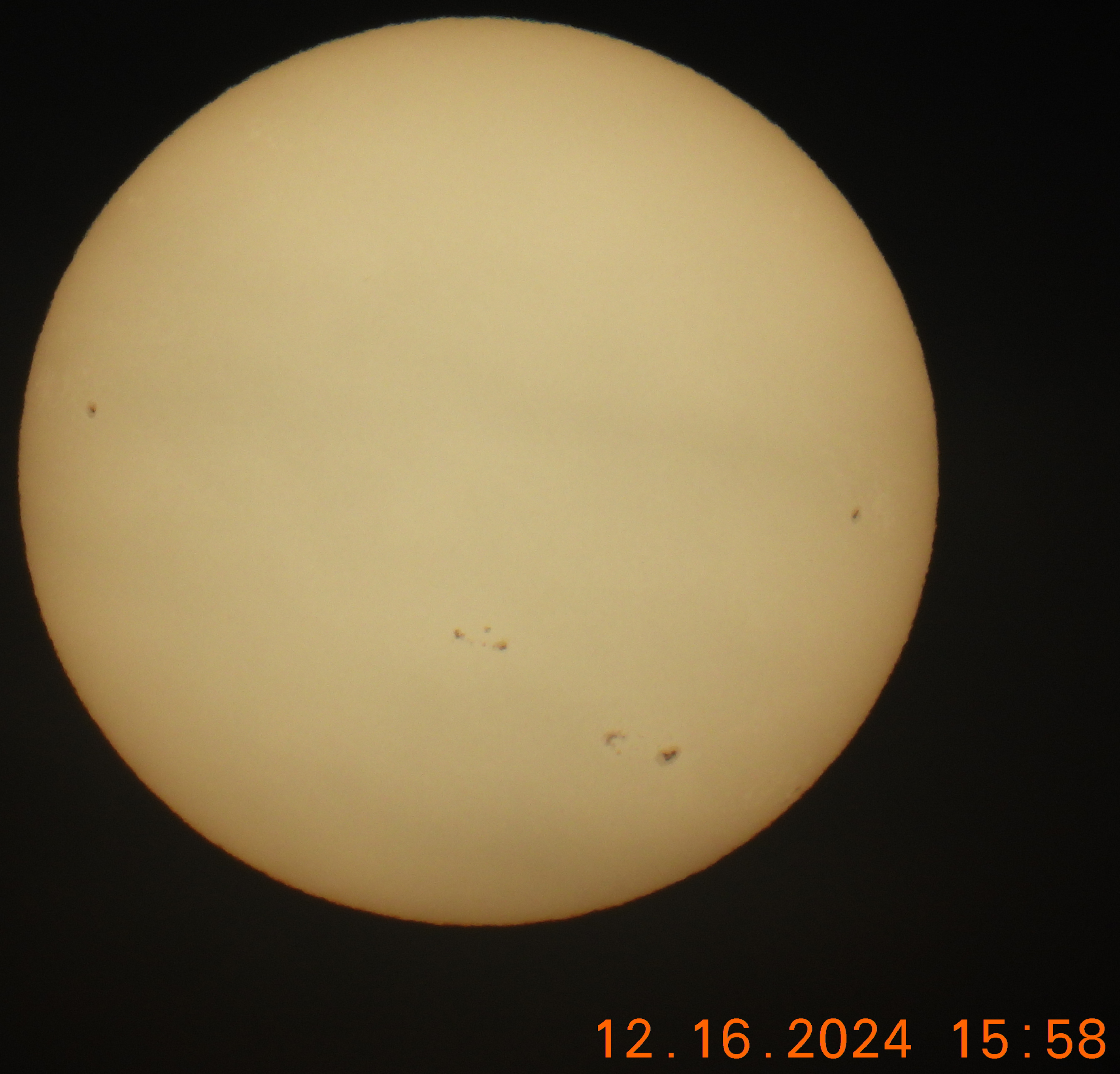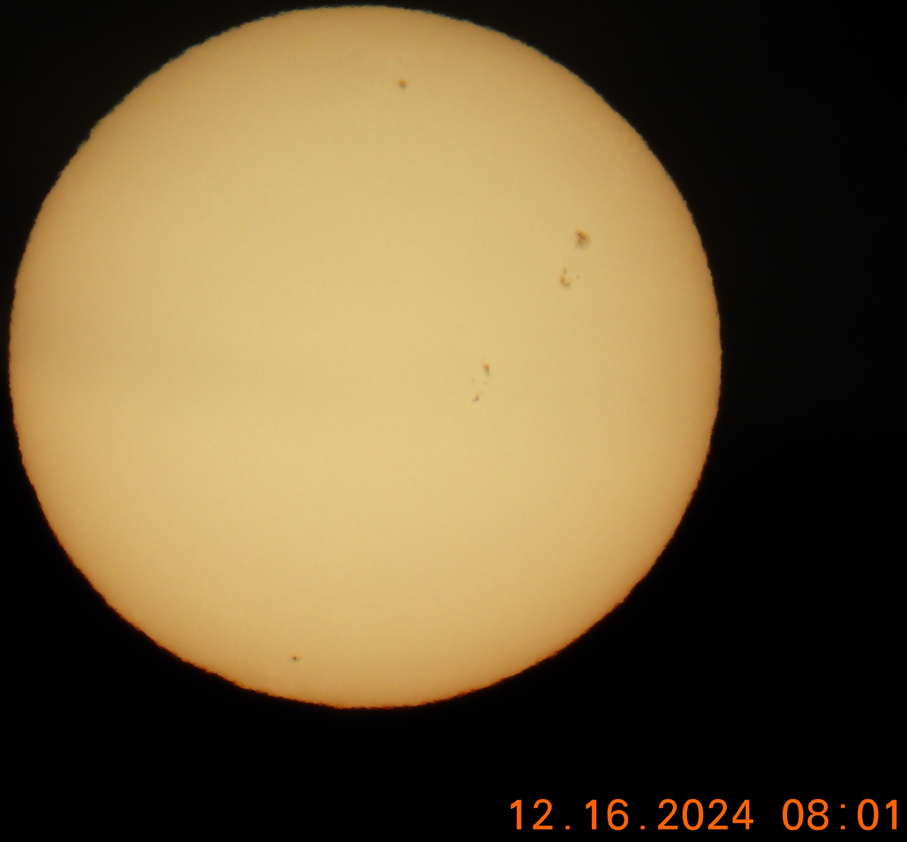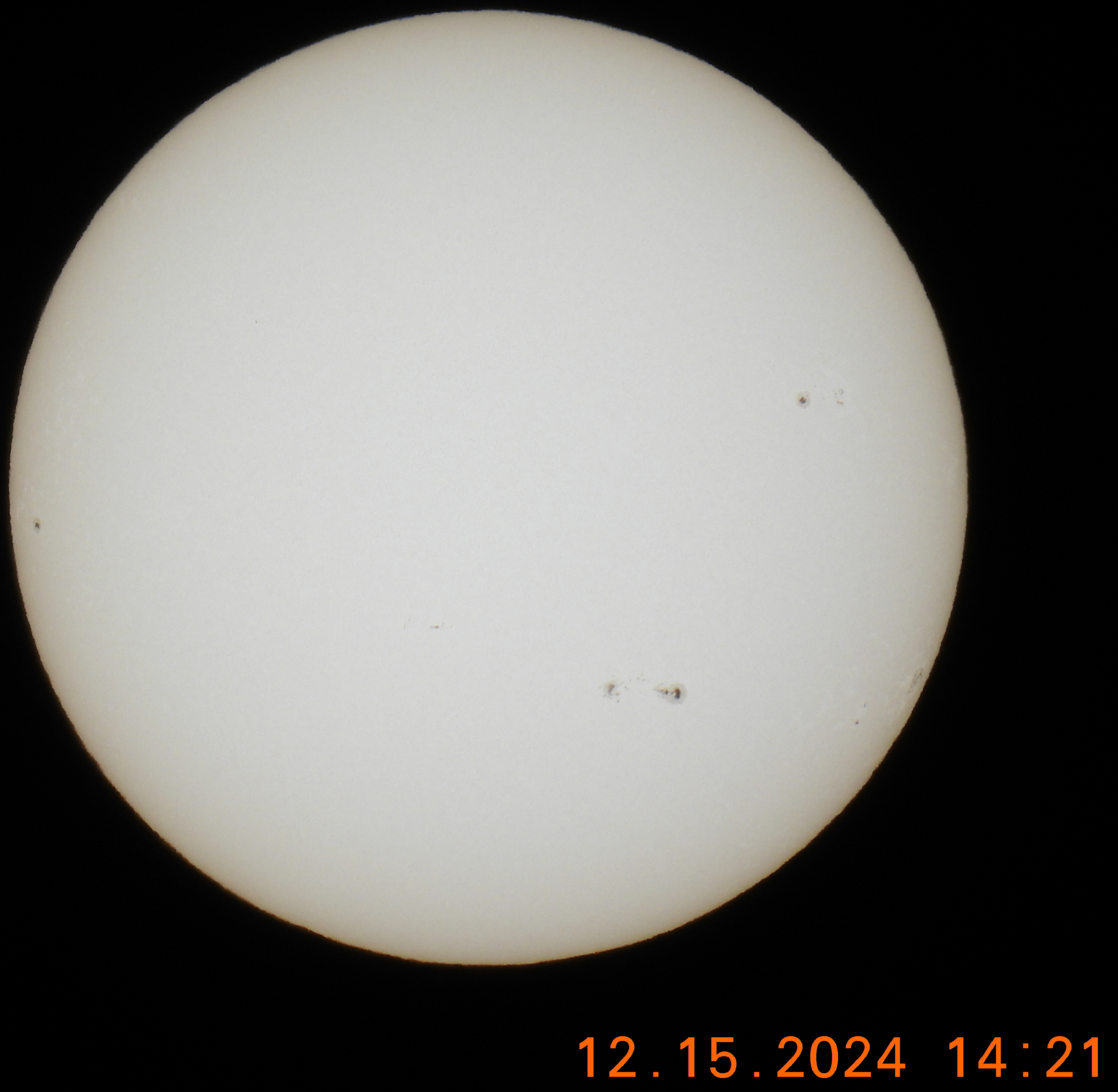 | 22:37, 17 December 2024 | Observation 015 Dec 14 24.jpg (file) | 462 KB | The images were taken with a Celestron NexStar Evolution 8" telescope with a 40mm lens, using a solar filter obviously. Then my cellphone was attached via a mount to the lens to get the pictures. Natively, the pictures come through the Schmidt-Cassegrain telescope mirrored left to right but I flipped them and cropped the top and bottom of the images to just show the sun in the center. This combination of scope and lens should give a magnification of ~50. | 1 | |