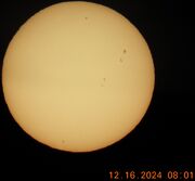 | 19:45, 24 December 2024 | Observation 006 Dec 17 24.jpg (file) | 810 KB | Image taken using a solar filter on a celestron c8 telescope with a cell phone camera mounted to a 40mm eyepiece. | 1 | |