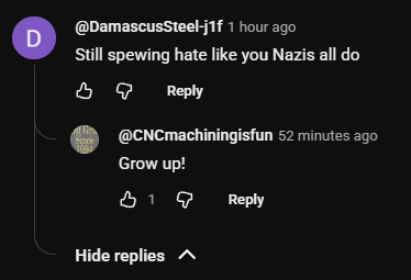 In a YouTube comment on 10 March 2026, flat Earther "andyandersonnn" openly described DamscusSteel as "One of the most idiotic and bitter stalkers on Youtube", whilst also admitting that DamascusSteel's continued failures to prove the Flat Earth "Makes the debunked cult looks [sic] really bad, without even realizing". DamascusSteel has since gone onto admit that the Flat Earth Cult "kids" can't handle the reality of Earth being a globe. | |||