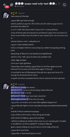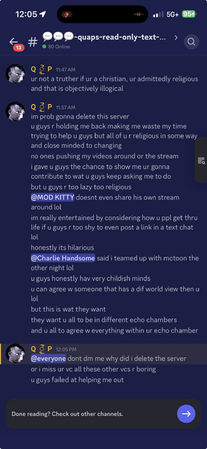 Over roughly 30 hours, QoP staged a full public meltdown in his "Anti-Truther League" Discord server — complaining that members failed to promote his content, insulting named members individually, pre-announcing then completing a server deletion, briefly reopening it, and finally deleting it for good the next afternoon. | |||