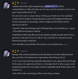 * '''Earlier same day''' — separately: ''"i spent hours last night explaining to @MOD KITTY all the contradictions in the christian world view and his steelman at the end was 'u just said nuh uh' lol,"'' followed by ''"beings that can be tricked by such lies deserve to be tricked by such lies, just like a fish deserves to get eaten after biting a hook."'' | |||
