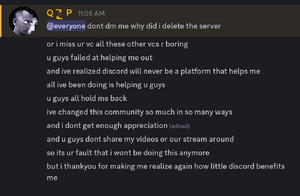 [[File:QoP_meltdown_announcements_past_streams_2026-04-18.png|thumb|Past-streams post in the announcements channel, "resulting in the server u guys like being deleted"]] | |||