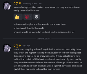 * '''2026-04-17 22:41''' (''#quaps-read-only-text'') — ''"women being christian makes more sense cuz they are submissive easily persuaded humans / but men waiting for another man to come save them is the gayest thing in the world."'' | |||