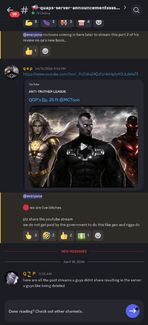 - 2026-04-16 21:53 (#quaps-server-announcements) — Announces Ep. 25 of "Anti-Truther League" ft. MCToon: "we are live bitches / plz share the youtube stream / we do not get paid by the government to do this like geo and Riggs do."