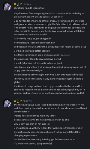 [[File:QoP_meltdown_christians_miracles_rant_2026-04-18.png|thumb|Christians / 18-wheeler / "met god" rant]] | |||