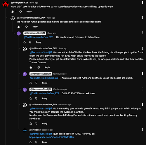 DamascusSteel has made several more demands to "challenge" MCToon to meet him at the shore to observe the sunset. MCToon has accepted the challenge and it has been agreed that DamascusSteel would meet MCToon in-person in Pensacola, Florida between 23/02/2026 and 27/02/2026. The meet has been advertised publicly on YouTube and on this page: Meetup_Pensacola_2026-02.