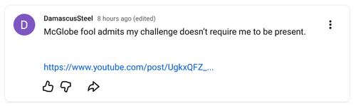 19 February 2026 23:22 - As predicted, DamascusSteel is weaselling out of travelling to Pensacola and attending his own challenge. In a post made on his own channel, DamascusSteel made a false claim that he is not required to be present. screenshot.