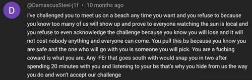 DamascusSteel's latest excuse as of 11 February 2026 (UTC) is that he is claiming that McToon only provided 3 weeks' notice of the challenge, and that wouldn't be enough time for people to make arrangements to be in Florida to witness the event. This is despite the fact that DamascusSteel himself agreed to the challenge some 2 months prior (in December 2025) and has made several posts asking others if they are also attending. In one comment over a month ago, DamascusSteel said "Are you going to meet us in Pensacola Florida for the Feb 23 27 livestream McTool claims he’s going to do". His claims of a 3 week notice period appears to be an excuse that he is fabricating, which he will use after the challenge as a reason why he didn't attend, and shifting the blame of his non-attendance onto others. He also appears to now be distancing himself from the challenge, claiming that McToon is the only people that needs to be in there in-person.